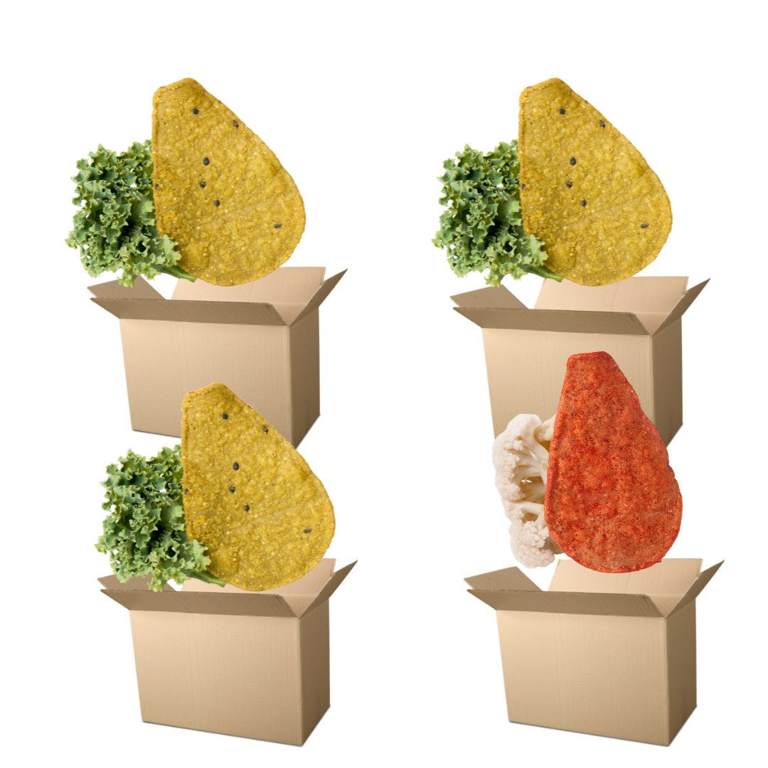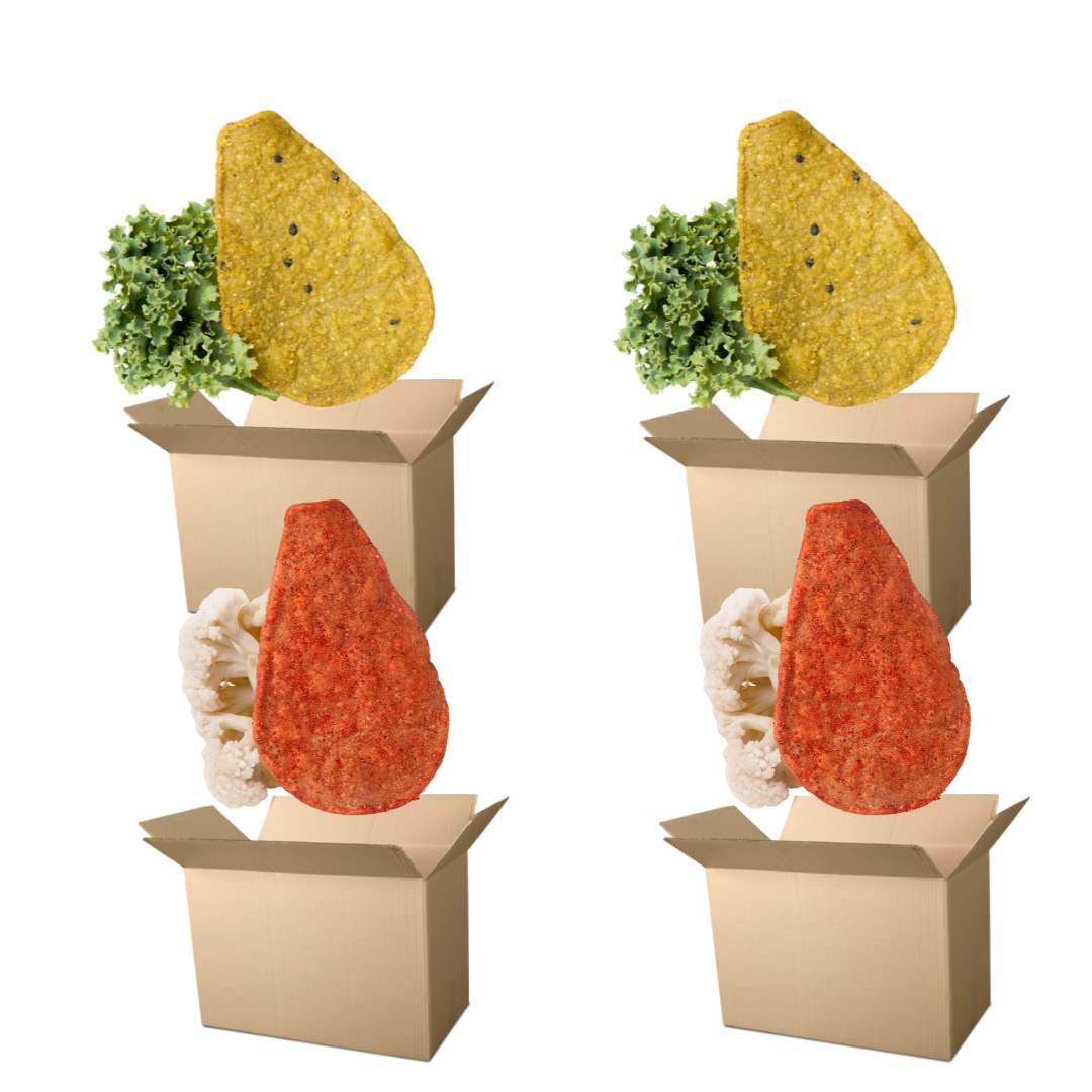 Cuatro cajas de Chips de Coliflor con Chile y Chips de Kale 50 gramos. Cada caja contiene 60 piezas de 60 gramos.